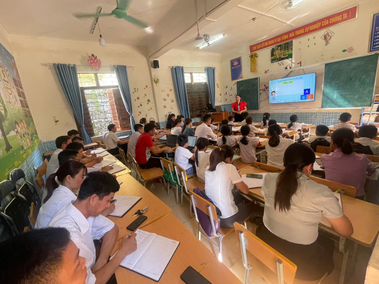 Sau tiết dạy, dưới sự điều hành của thầy giáo Hà Hữu Chí – Phó hiệu trưởng, các thầy cô giáo đã cùng nhau trao đổi, chia sẻ kinh nghiệm, rút ra bài học về cách ứng dụng hiệu quả công nghệ AI trong quá trình dạy học, đồng thời thảo luận những khó khăn, giải pháp phù hợp với điều kiện thực tế của nhà trường vùng cao.